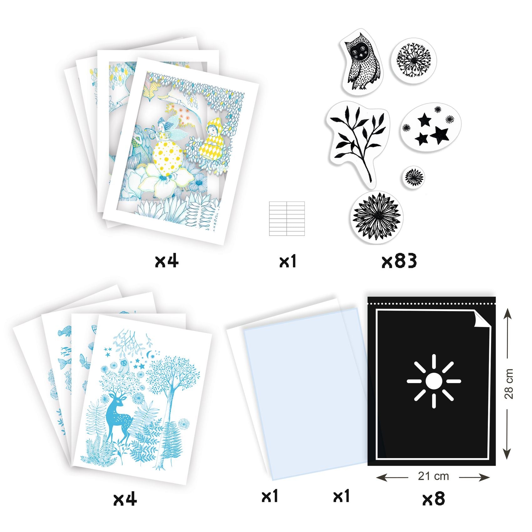 Magique, cette activité s’inspire d’un procédé emprunté à la photographie : le cyanotype. À l’aide de motifs opaques, l’enfant crée des décors sur un papier photosensible. Après une exposition au soleil, le papier est marqué des motifs en négatif. Il n’y a plus qu’à rincer le papier dans un bain d’eau claire et le décor se révèle sur fond bleu ! Ces créations deviennent les fonds nocturnes qui complètent les illustrations de 4 tableaux poétiques.