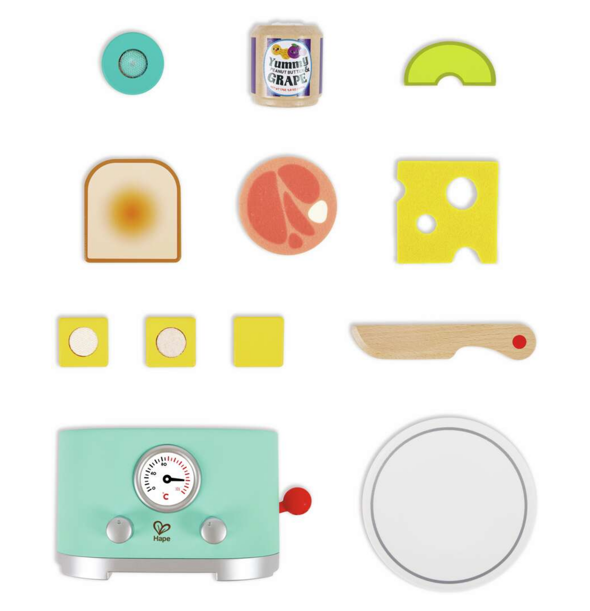 - UNE MULTITUDE D’ACCESSOIRES : ce set comprend un grille-pain, deux tranches de pain grillé, trois tranches d’avocat, du beurre « à tartiner », de la confiture, du jambon, du fromage, un couteau et une assiette.