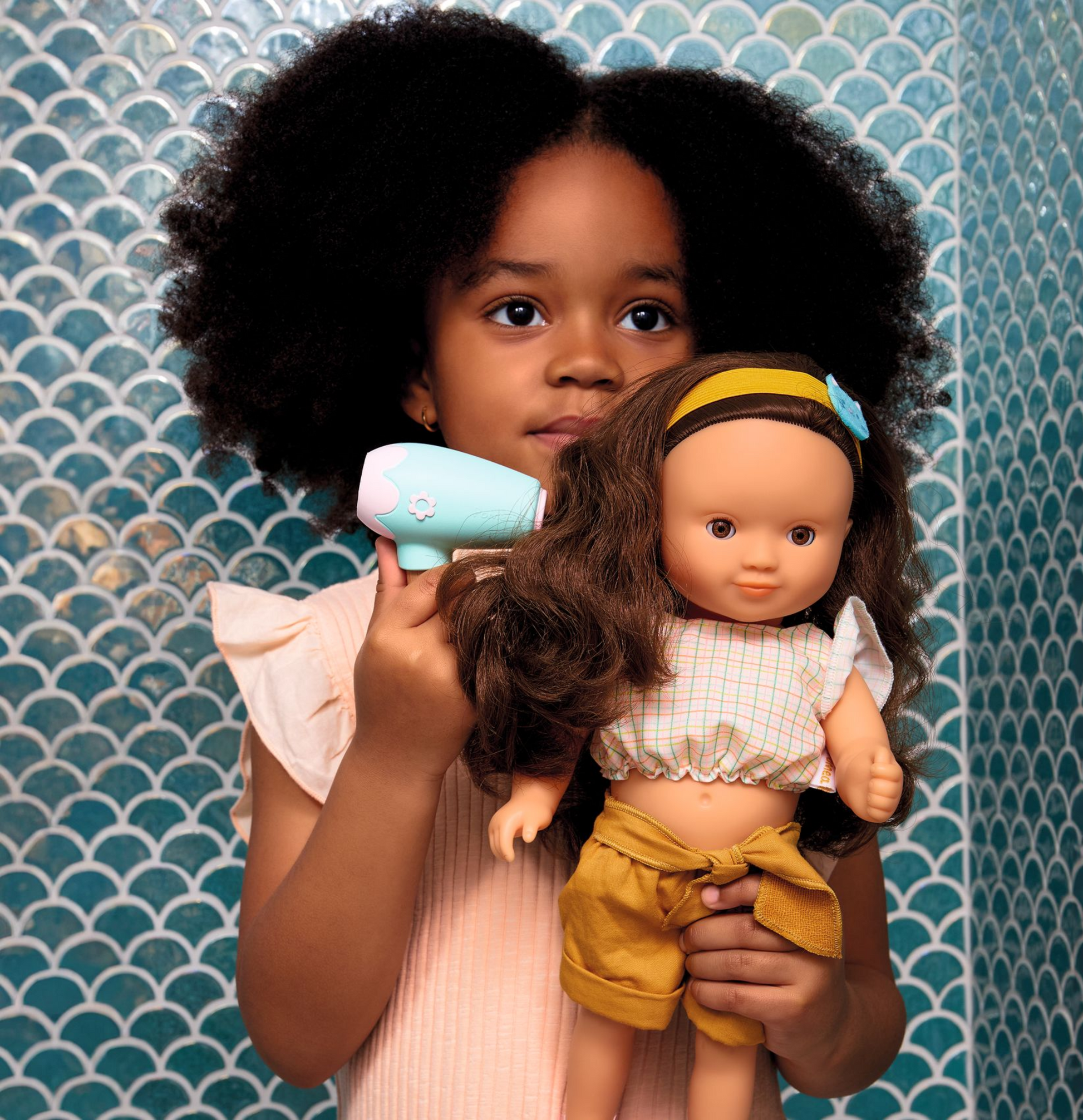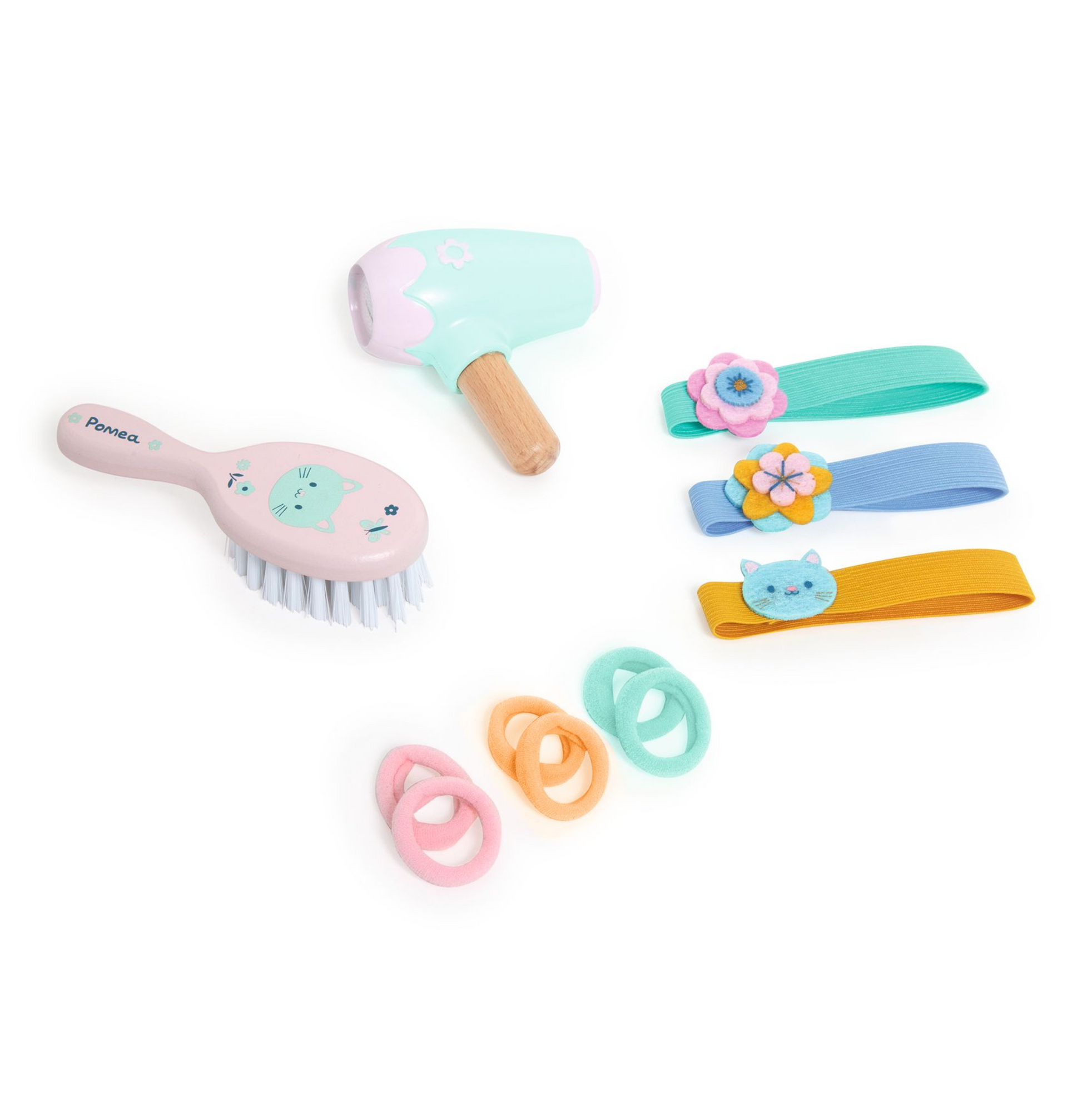 Avec sa jolie trousse bien garnie, l’enfant s’improvise apprenti coiffeur et imagine une multitude de coiffures sur sa poupée. Après avoir fait semblant de sécher les cheveux de sa poupée, la brosse en bois avec des fibres souples démêle et fait briller la chevelure de la poupée. Il est temps de passer à la coiffure, mais que choisir ? 3 bandeaux trop mignons avec le petit chat, les fleurs se positionnent facilement sur la tête de la poupée, 6 élastiques en mousse : idéal pour faire des couettes.